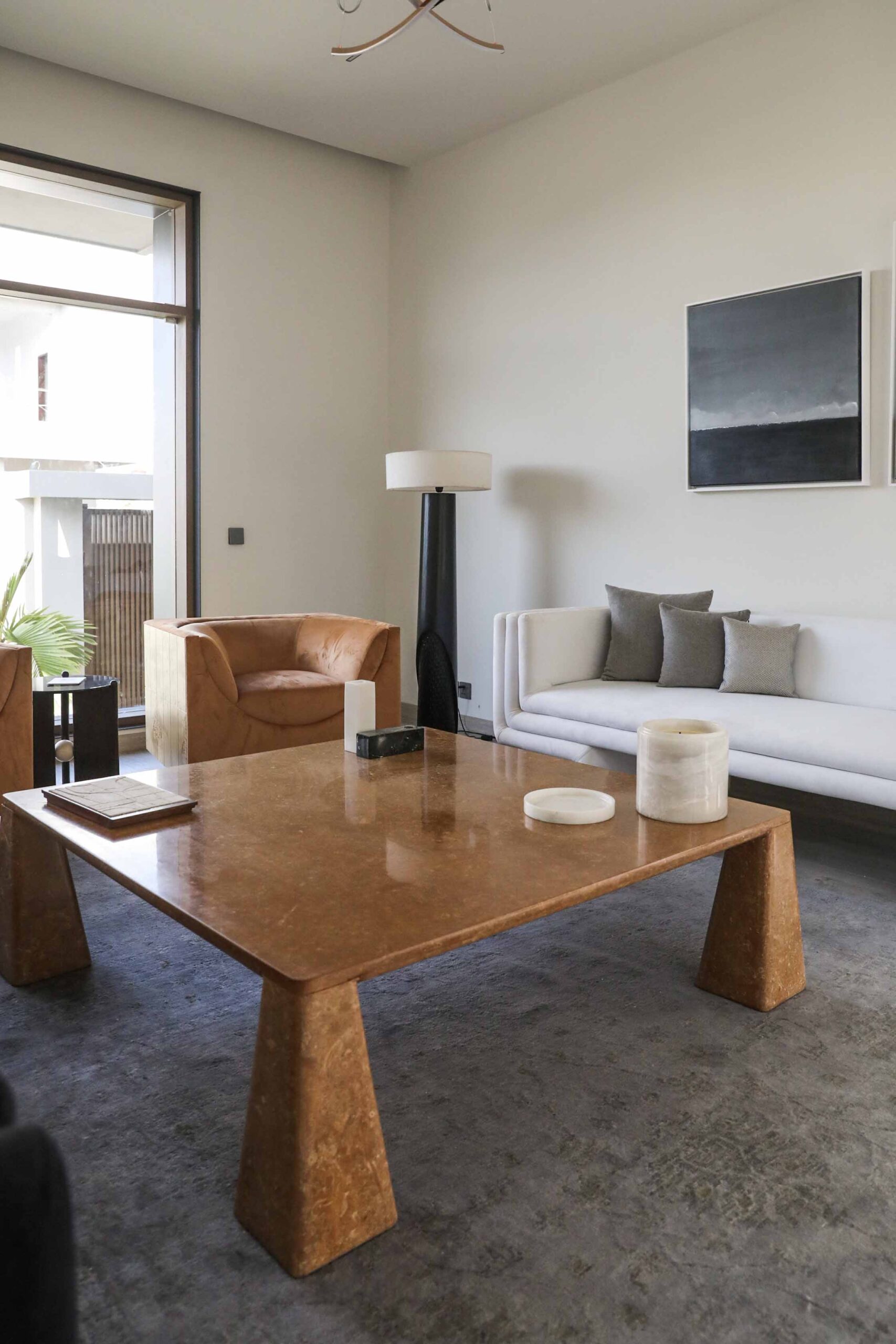 The Basha Coffee Table exudes a quiet confidence with its no-nonsense attitude. Its square marble top, adorned with pencil-round