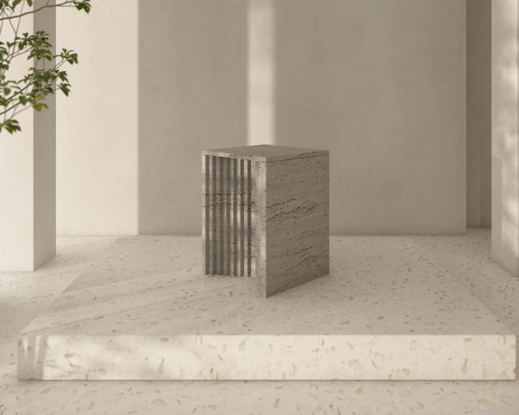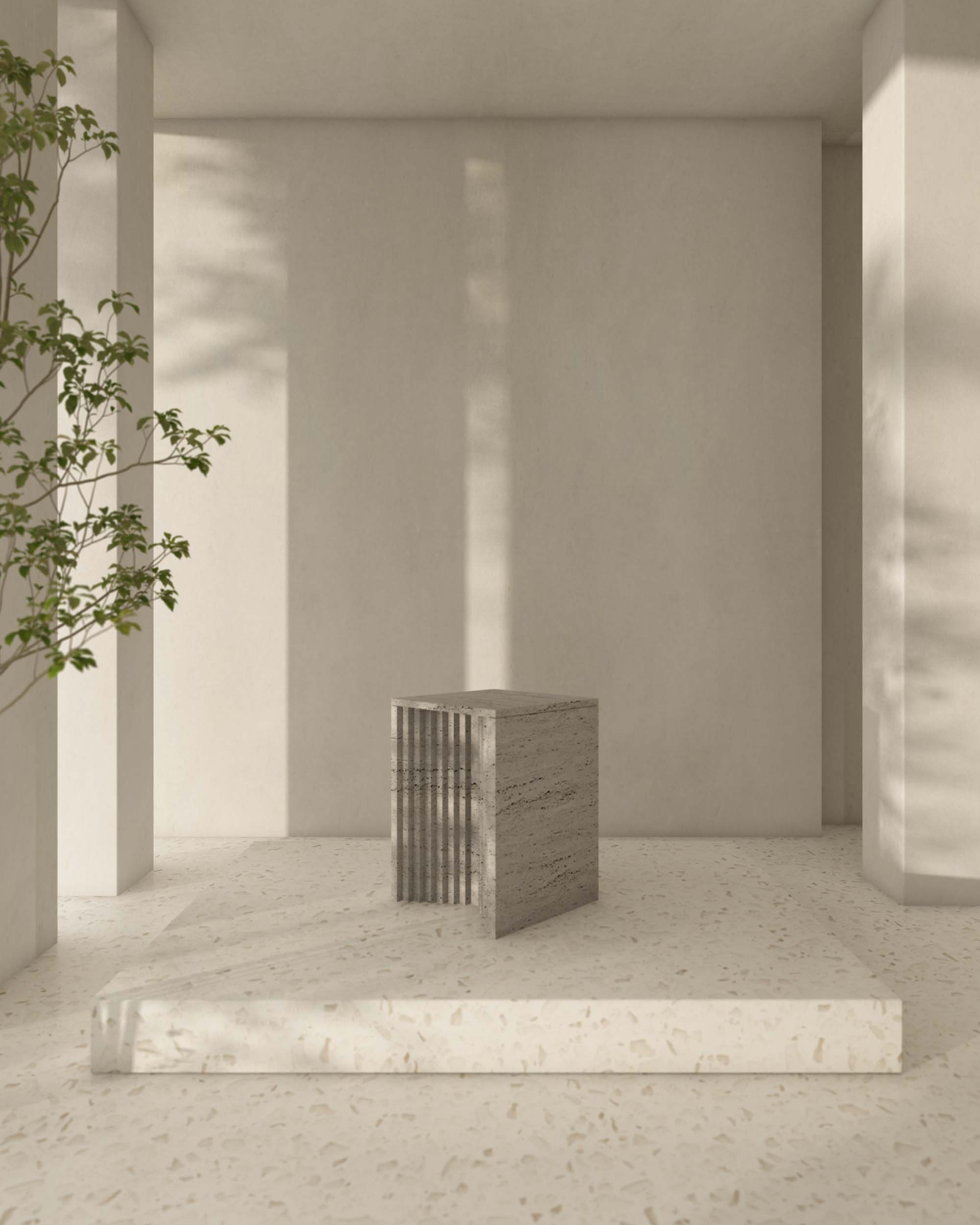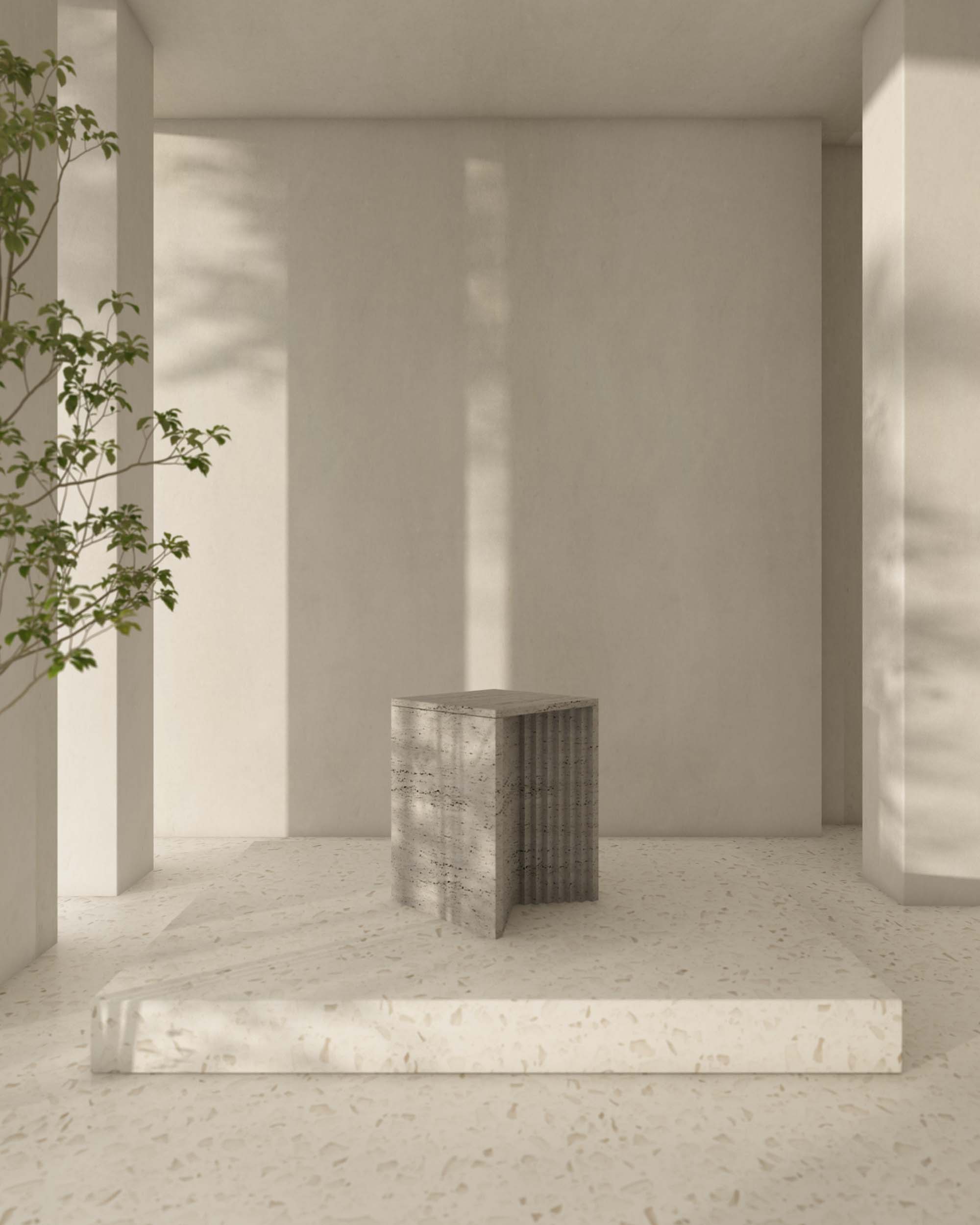 marble, harboring light and shadow between each crevice. As dramatic plinths, they offer a sophisticated platform for vases, trays, or