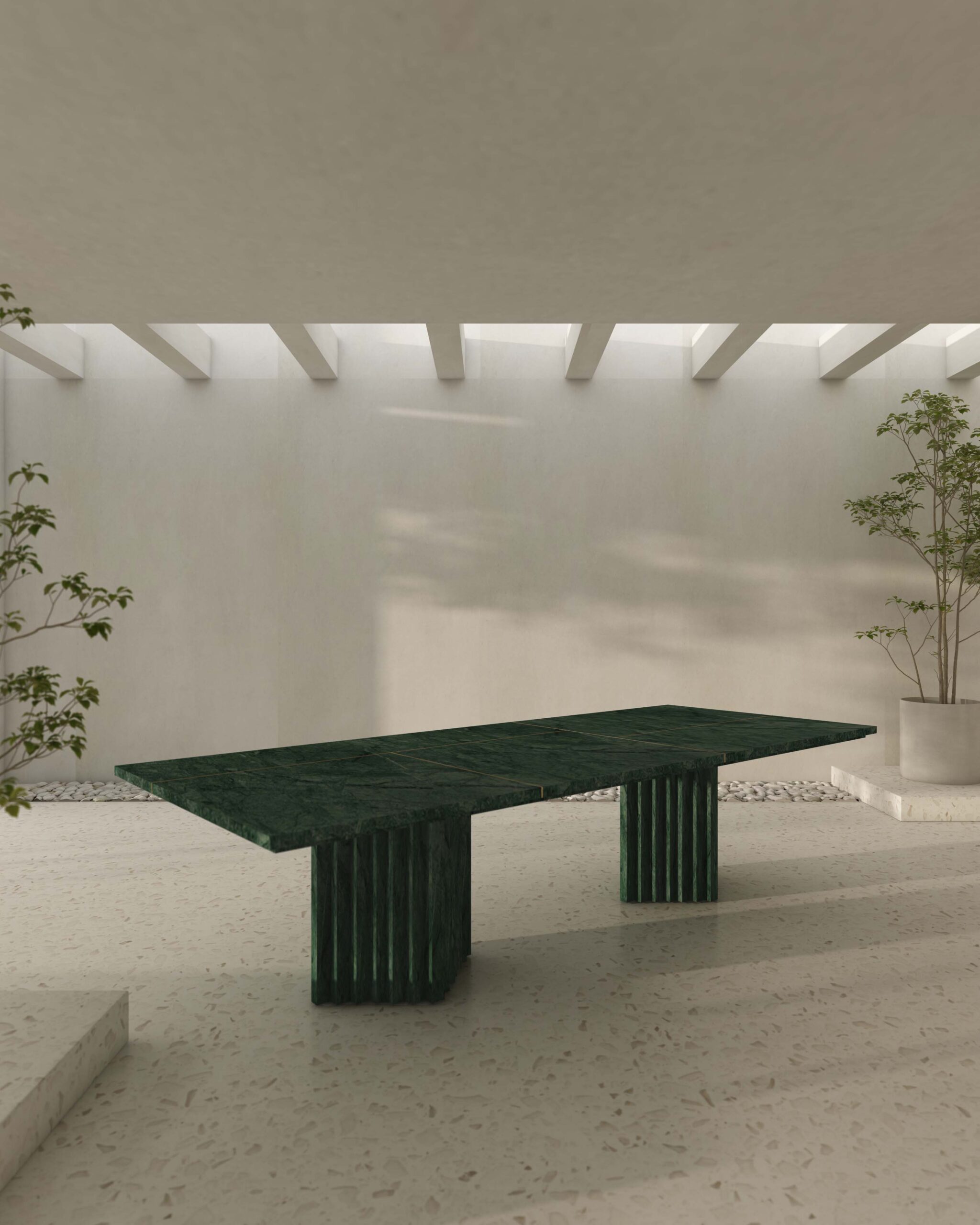 The Portico Dining Table is a masterpiece crafted entirely from local marble, spanning an impressive 10 feet in length. Supported by